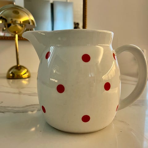 Arabian punapilkullinen Ping pong -kannu, hyvässä kunnossa. Tilavuus 1 litra. Voin postittaa postikuluja vastaan tai kulkiessani tuoda Nokialle tai osaan Tamperetta.