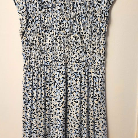 Saint Tropez mekko naisille, koko XL. Materiaalina viskoosi. Mekossa on musta pohjaväri ja sininen, kirjavakuvioinen printti. Pitkät hihat, joissa joustava hihansuu, sekä V-pääntie. Helma on väljä ja kevyesti laskeutuva. Sopii arki- ja vapaa-ajan käyttöön lämpimään vuodenaikaan tai kerrospukeutumiseen viileämmällä säällä.