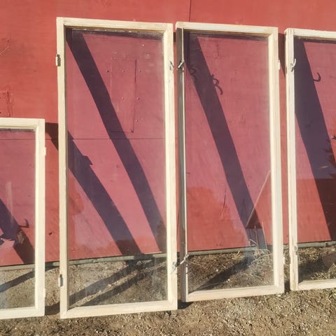Omakotitalosta purettuja ikkunoita. Siitä kesäkeittiöön tai kasvikuoneeseen ikkunat.