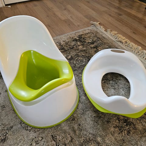 Pöntön mallinen potta. Vedettäessä kuuluu ääni. Pottaosan saa helposti irti tyhjennystä varten. Viereen saa oman vessapaperirullan