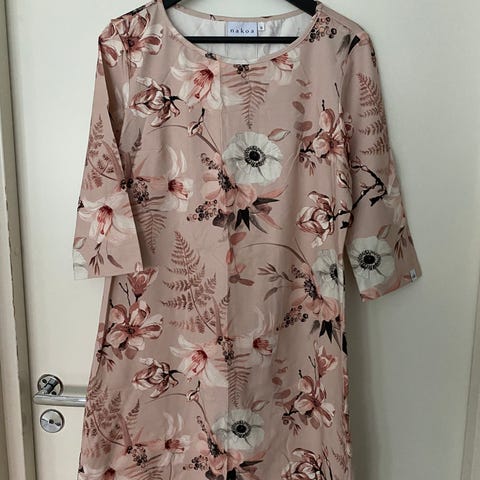 Nakoan kaunis versailles-kuosinen Annika-mekko. Pesty kaksi kertaa. Mekossa takana vetoketju ja edessä valekietaisu. Materiaali lyocell ja viskoosi.