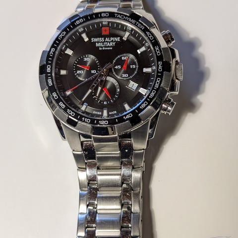 Swiss Military Hanowa miesten rannekello sinisellä kellotaululla ja ruskealla nahkarannekkeella. Kellossa on analoginen näyttö, päivämääräikkuna ja sekuntiosoittimet. Ranneke on kuvioitua nahkaa metallisella soljella, jossa Swiss Military -logo. Kellon mukana tulee Swiss Military Hanowa -kellorasia kuvien mukaisesti. Koneisto on quartz ja kellon koko on 40mm.