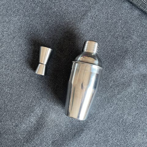 Kotibaarivälinesetti: 3-osainen shaker, 2/4 cl mitta, puumurskain, siivilä, baarilusikka murskaimella ja drinkkivihko.