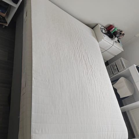 Runkopatjasänky (Piscina, vanhempaa mallia) 140cm x 200cm, uudehko paksumpi petauspatja ja puiset jalat.