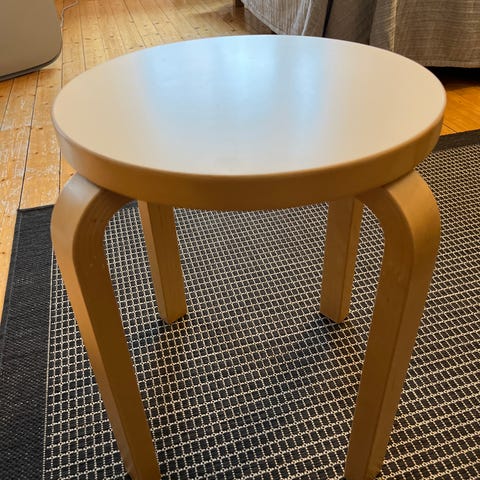 Istuimen pinta koivuviilutettu, jalkarengas ja jalat koivua, väri valkoinen. Nämä ovat vielä paketissa avaamatta kun ostimme vahingossa väärän korkuiset. Kuttaaltaan symmetrinen jakkara.
