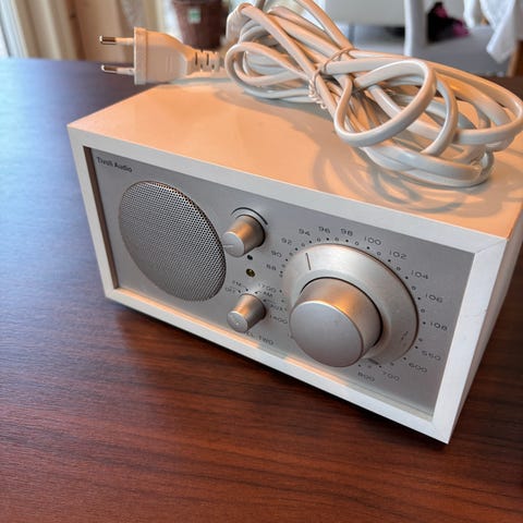 Tivoli Audion radio, Model One. Toimii oikein hyvin ja yleisilme siisti, mutta hienoisia naarmuja pinnassa ja pari pientä tahraa, kun tarkkaan tutkii. Alla olevista tassuista yksi puuttuu ja korvattu toisella. Huomioitu hinnassa.