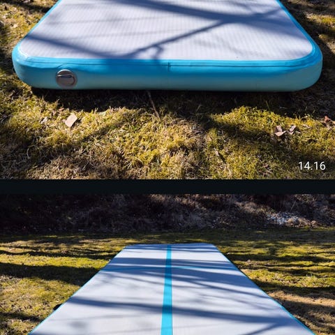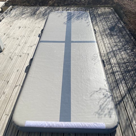 Air track ilmavolttirata 3 x 1 x 0,1 m. Keskiviiva hyppyjen ja volttien kohdistamiseen, kantokahvat pitkällä sivulla. Kestävät laminoidut saumat. Sopii myös vesileikkeihin.