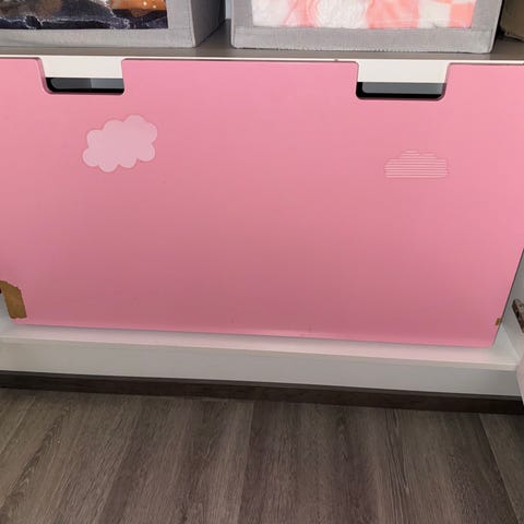 Valkoinen melamiinipintainen levy on helppo pyyhkiä puhtaaksi. Kokonaisuus on suunniteltu lastenhuoneeseen ja tarjoaa sekä työskentelytason että säilytystilaa.