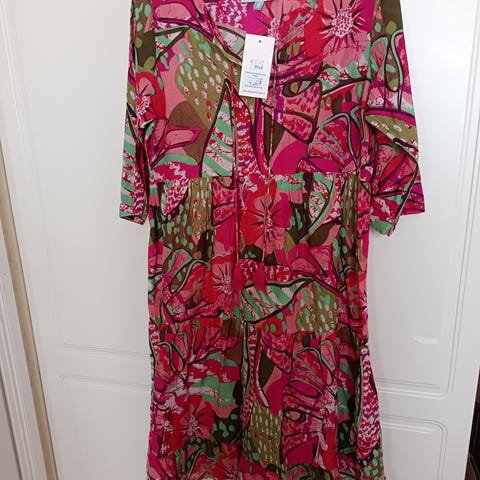 H&M naisten kesämekko, koko 38. Mekko on valmistettu puuvillasta ja siinä on kirjava oranssi-valkoinen kuosi. Mallissa on puolipitkät hihat, vyötäröllä kiristettävä nauha ja pyöreähkö pääntie halkiolla edessä. Sopii arkeen ja vapaa-aikaan lämpimiin säihin.