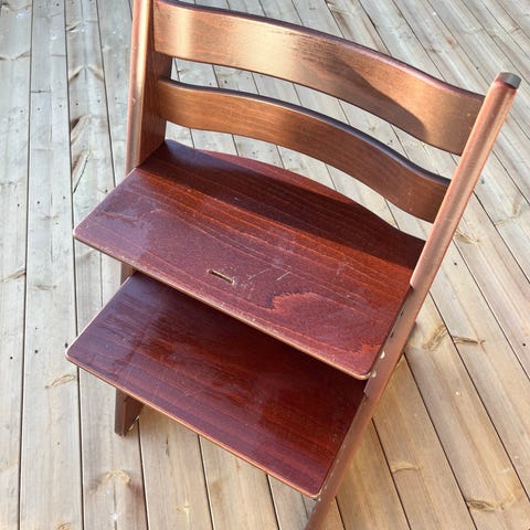 Stokke Steps syöttötuoli. Tuolissa on valkoinen istuin- ja jalkataso sekä tummat jalat. Istuinosassa on selkänoja ja sivutuet, ja jalkataso on säädettävissä useaan korkeuteen. Syöttötuoli soveltuu lapselle, joka osaa istua itse, ja sitä voidaan käyttää ruokailutuolina pöydän ääressä. Tuoliin on erikseen ostettavissa pienemmän lapsen osa, joka on helppo kiinnittää. Materiaali on yhdistelmä puuta (jalat) ja muovia (istuinosa).