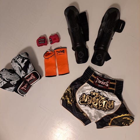Twins kamppailulajivarustesetti, koko M. Settiin kuuluu kamppailulajeihin soveltuvia varusteita, kuten säärisuojat, nyrkkeilyhanskat, käsisiteet, lyhyet kamppailushortsit sekä alasuojat. Väriteemana on musta, punainen ja valkoinen. Varusteet on suunniteltu kamppailulajeihin, kuten thainyrkkeilyyn tai potkunyrkkeilyyn, ja ne sopivat naiselle, joka käyttää vaatekokoa M/L