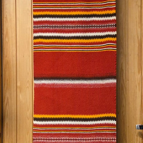 Kaarina Nikan suunnittelema Revontulet ryijy/raanu. Pituus ilaman telinettä 141cm leveys 44cm. Teline tulee mukaan ja sen saa irroitettua.