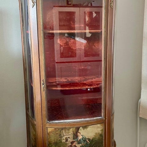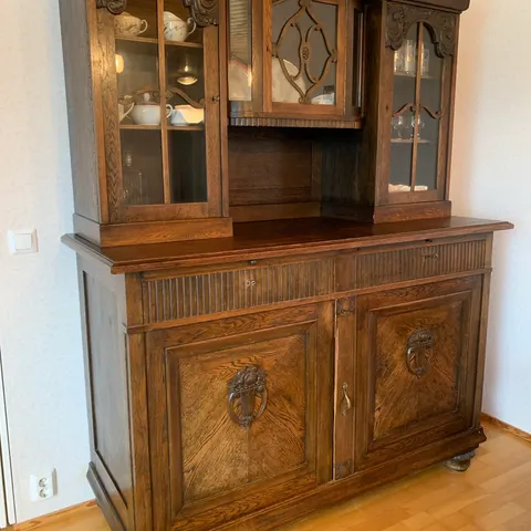 Vitriinikaappi, jossa kaksi lasiovea ja useita hyllyjä astioiden tai koriste-esineiden säilytykseen ja esillepanoon. vetolaatikot pientavaroiden säilyttämiseen. Materiaalina tumma puu, jossa koristeelliset yksityiskohdat. Sopii esimerkiksi olohuoneeseen tai ruokailutilaan astia- tai koristekaapiksi. Hinta: 300€ käteismaksu!