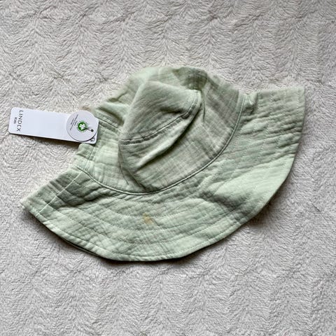 Uusi Lindexin musliinii-kankainen vaalean vihreä (todella vaalea mintunvihreä) hellehattu kesään. Koko 4-5.