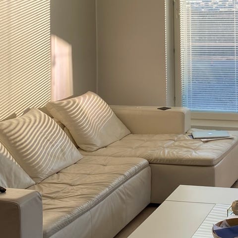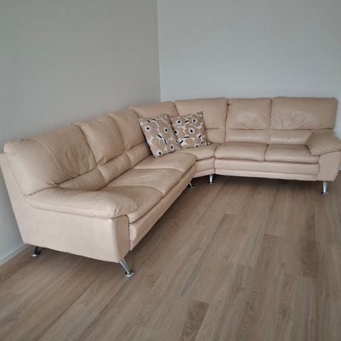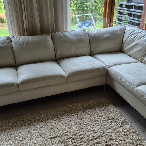 Myyntiin valkoinen nahkasohva. Hyvässä käytetyssä kunnossa, yksi näkyvä vika, josta kuvassa erikseen. Istuinosa ja tyynyt nahkaa, runko keinonahkaa. Vain nouto. Koiratalous.