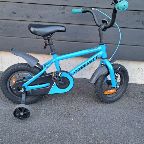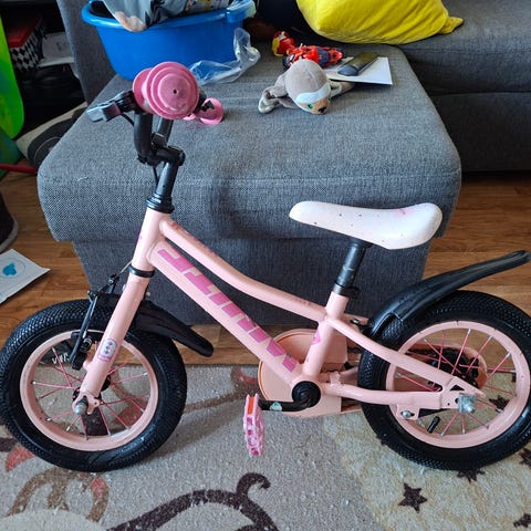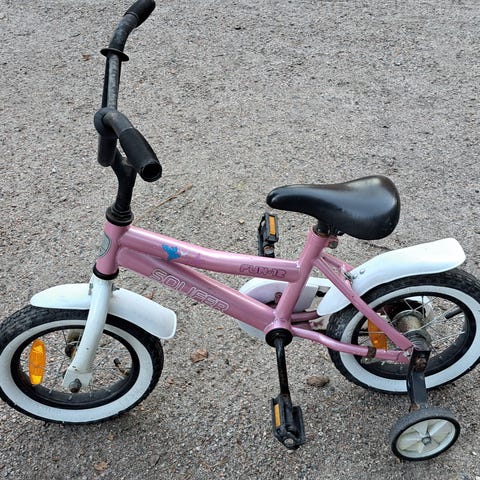 Lasten polkupyörä, jossa 12" renkaat. Runkoväri vihreä ja renkaat vaaleat. Pyörässä on takana tavarateline ja ohjaustanko aikuiselle työntämistä ja ohjaamista varten. Sopii pienelle lapselle ensimmäiseksi tai varhaiseksi polkupyöräksi lyhyille matkoille ja harjoitteluun.