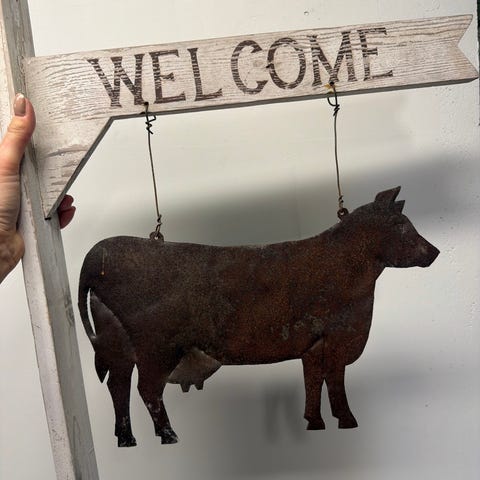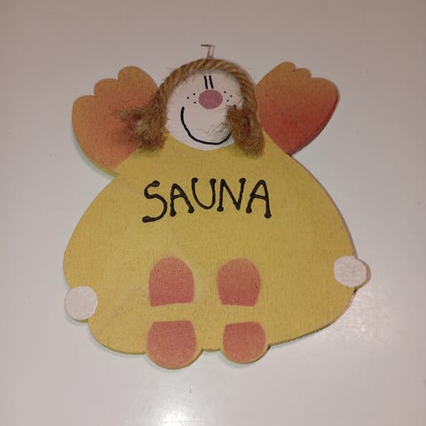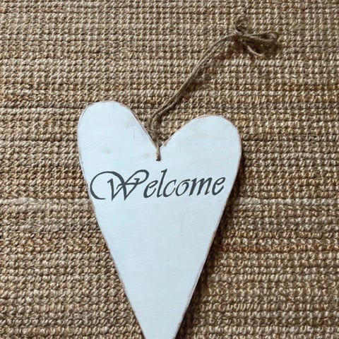 Ripustettava tervetuloa-kyltti oveen. Puun värinen. Huomaa kuvasta vääntyminen.