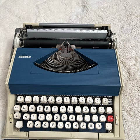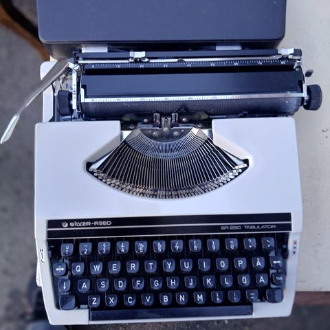 Scheidegger kirjoituskone harmaalla rungolla. Mekaaninen kirjoituskone kirjaimellisella näppäimistöllä. Soveltuu kirjoittamiseen, harjoitteluun tai rekvisiittakäyttöön.