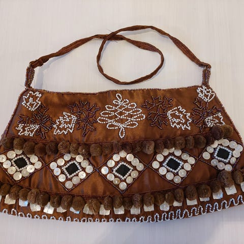 Sagat, Seija Ranttilan upea villakangas olkalaukku jossa somisteena saamenkielinen teksti: ”neljä vuodenaikaani-värejä esi-isieni mailta”. Laukun mitat: kehyksen leveys 22 cm, laukun korkeus 18,5 cm, leveys 27 cm, pohjan leveys 12 cm. Sisällä vuori ja vetoketjullinen tasku.