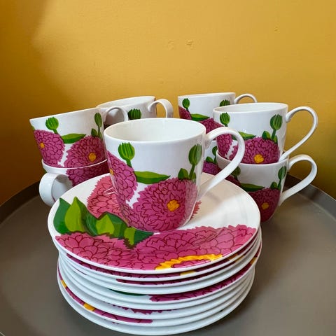 Iittala astiasarja 2 mukia, 2 kulhoa ja 2 leipälautasta vihreä kukkakuvio