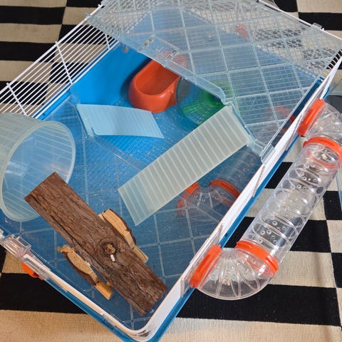 Huom, VAIN häkki putkineen ja tasoineen, EI sisällä mökkiä, ruokakuppia ja juoksupyörää. Mukana erillinen juomapullo 75ml, mineraalikivi ja pari lelua kattoon.