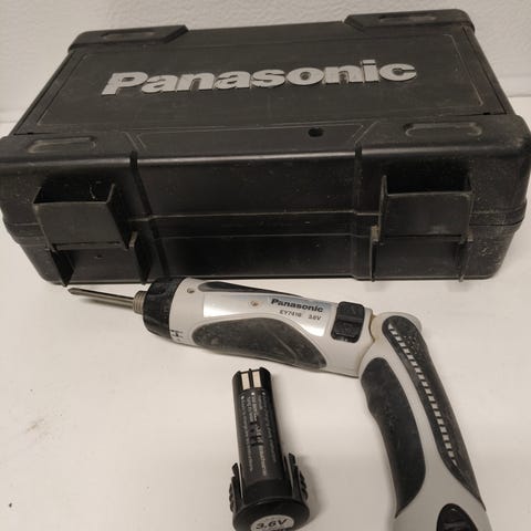 Panasonic Drill & Driver EY503 ruuvinväännin. Kompakti, musta akkukäyttöinen ruuvinväännin, jossa suora- ja kulma-asentoon kääntyvä runko. Sopii ruuvien kiristämiseen ja avaamiseen erilaisissa kotitalous- ja harrastetöissä. Laitteessa eteen- ja taaksepäin -suunnan valinta sekä virtakytkin rungossa. Akku mennyt vanhaksi, muuten toimiva kone. Laturi kuuluu hintaan.