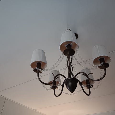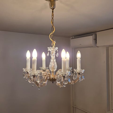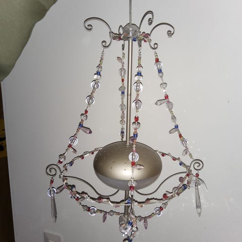 Myydään ”kattokruunu”. Runko ja ”kristallit” muovia, kiinnitysketju metallia.