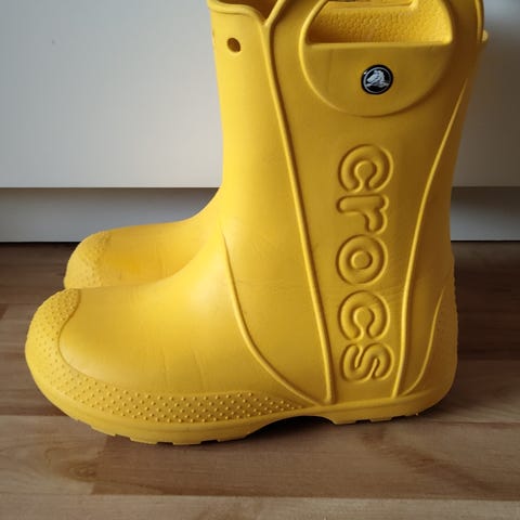 Crocs lasten kumisaappaat, koko 34. Väri keltainen, unisex-malli. Saappaat ovat kevyttä, helposti puhdistettavaa materiaalia ja niissä on sivuilla kahvat pukemisen helpottamiseksi. Virallinen koko J3, mikä vastaa n. kokoa 34-35.