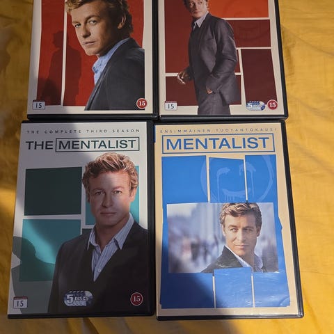 The Mentalist kausi 1 DVD-boksi. Pakkaus sisältää kuusi DVD-levyä, joilla on koko ensimmäinen tuotantokausi.