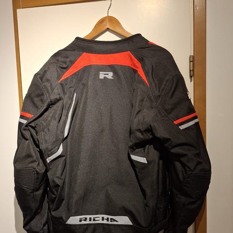 Richa moottoripyörätakki. Useita vetoketjutaskuja edessä. Olka- ja kyynärpäissä on topatut ja vahvistetut alueet. Sisäpuolella on merkinnät CE-hyväksytyistä suoja-alueista sekä Richa Zip Connector System -vetoketju, jolla takin voi kiinnittää yhteensopiviin housuihin. Materiaali on kulutusta kestävää tekstiiliä, jossa on verkkovuori. Takki on suunniteltu moottoripyöräkäyttöön ja tarjoaa suojaa ajossa.