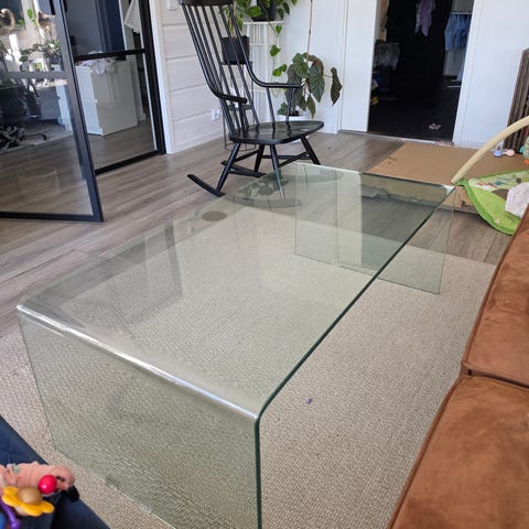 Todella siisti puinen sohvapöytä lasisella keskiosalla.