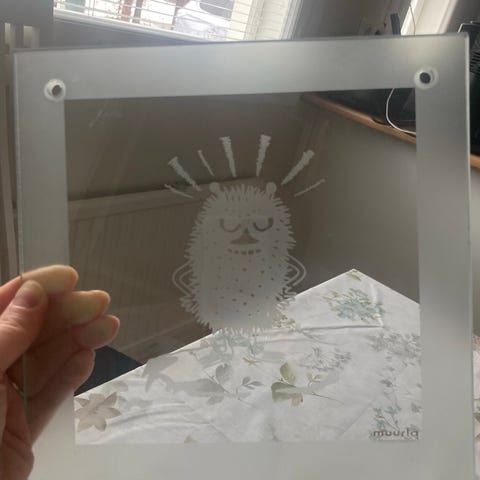 Muumimamman kuvalla lasinen ikkunakoriste, jonka voi laittaa roikkumaan mukana olevalla vaijerilla.