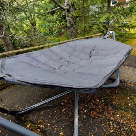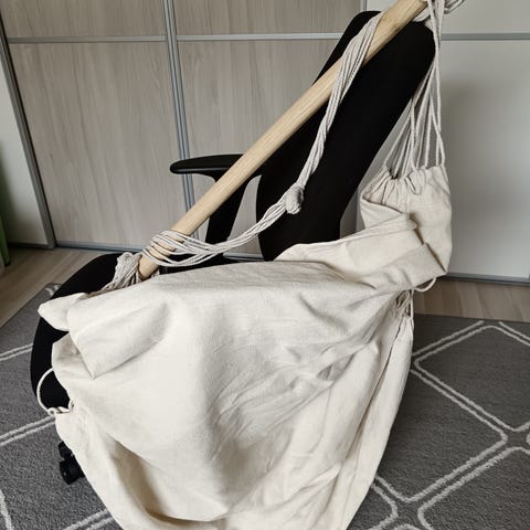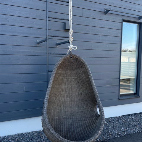 Valkoinen riippukeinu ulkokäyttöön. Materiaalina on polyrottinkia muistuttava punos ja metallinen runko. Keinu on tarkoitettu ripustettavaksi telineeseen tai kattoon erillisen kiinnityksen avulla. Sopii terassille, parvekkeelle tai puutarhaan istumiseen ja rentoutumiseen. Huomioitava, että tuote on säilytetty ulkona ja siinä voi olla käytön ja sään aiheuttamia jälkiä.