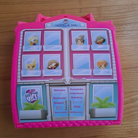 Palace Pets hahmot ja kirja. Kirjan lopussa säilytyslokero hahmoille ja leikkialustalle