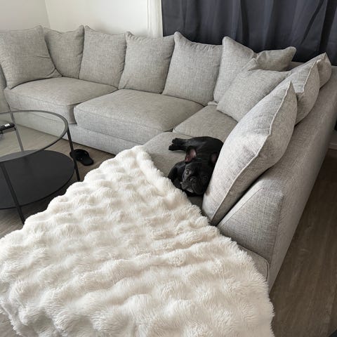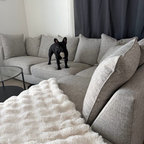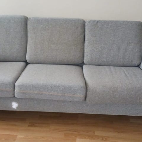 L-mallinen Pohjanmaan Kalusteen siisti kulmasohva harmaalla kangasverhoilulla. Sohvassa on useita istumapaikkoja ja kulmarakenne, joka sopii sijoitettavaksi huoneen nurkkaan. Verhoilu on tasaisen harmaa ja pinnaltaan kudottua kangasta. Selkänojissa on erilliset pehmustetut selkätyynyt. Sohvan toisessa päädyssä on pidempi istuinosa, joka toimii lepotasona. Runko lepää matalilla puujaloilla. Mitat: 2550 x 2050. Kissoja taloudessa, hieman kissojen kynsimiä langan nousuja, ei kuitenkaan rikki mistään. N. 5 vuotta vanha.