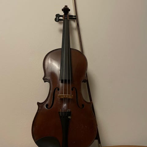 Tämä on ollut sukulaisella 80/90 -luvun taitteesta lähtien ja lähinnä kaapissa. Viulu vaikuttaa vanhalta (kotelossa nahkahihna jne.), mutta ei ole mitään leimoja tai tekstejä eikä se kovin hyvässä kunnossa ole. Mutta kaunis ääni tosiaan. Kokonaisuus vaatii kuitenkin huoltoa.