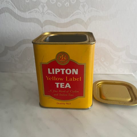 Twinings English Breakfast Tea metallinen teepurkki. Punainen, neliönmuotoinen peltirasia irtoteelle tai säilytykseen. Kannellinen purkki, jossa kultainen kansi ja painetut tekstit englanniksi. Soveltuu esimerkiksi teen, kuivatuotteiden tai pienten tavaroiden säilyttämiseen sekä keittiön sisustuselementiksi.
