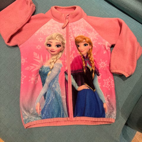 Myynnissä hyväkuntoinen mutta jo pieneksi jäänyt tyttöjen Disneyn Elsa & Anna välitakki, koko 98, väri vaaleanpunainen.