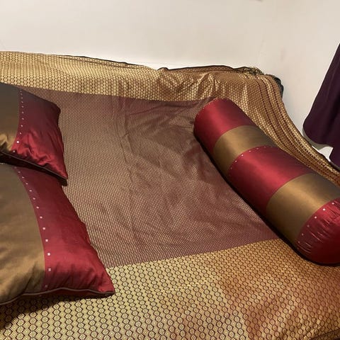 Kurkkaa myös muut kohteeni, joissa on tyynyihin sopiva iso oranssi päiväpeitto sekä samaa sävyä olevat verhot myynnissä. Peitto näkyy kuvissa taustalla.