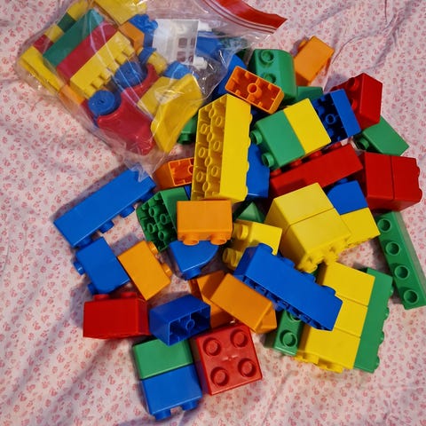 Kasa punaisia legoja kannellisessa säilytyslaatikossa.