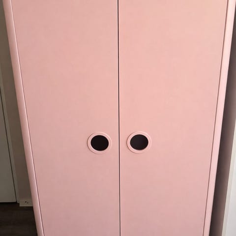 Vaaleanpunainen IKEA Busunge lasten vaatekaappi kahdella ovella. Sisällä vaatetanko sekä kaksi hyllyä. Pieniä käytönjälkiä hyllyissä ja reunoissa, ei haittaa käyttöä. Yleisilmeeltään siisti. Mukaan saa halutessaan 11kpl muovisia henkareita. Näitä löytyy myös muun värisinä :)