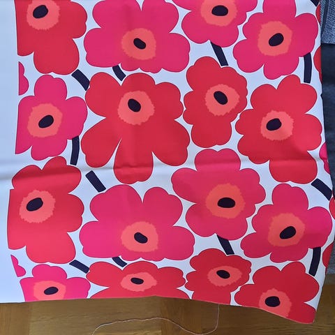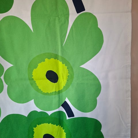 Ei ollutkaan omaan sisustukseen sopiva väri. Ommeltu päät (nipsuille) kokeiltu ikkunaan ja otettu pois parin päivän päästä, koko n. 145*240 *2. Eli n. 5m kangasta yhteensä. Hulpioita ei ole ommeltu. Voi olla vähän pidemmätkin, en saanut ihan tarkkaa mittaa, arvioitu alakanttiin siis... Ovh 47€/m