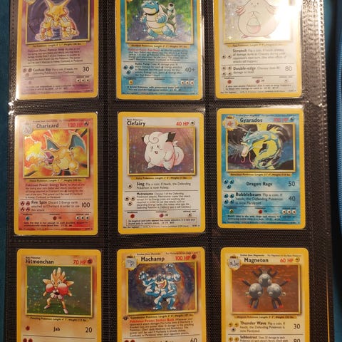 Myynnissä Pokemon-kortteja ensimmäisestä Base-sarjasta. Osassa kortteja hieman kulumaa takana. Ei holo-kortteja.