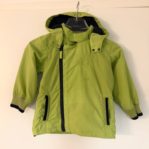 Vihreä hupullinen "kaupunkitakki", Zara koko 92. Kevyt, sopiva välikauteen. Vaaleanpunainen vuori ja "helmiäis"napit. Nappilista camokuosi. Selässä " Don't forget to play" oranssilla. Hihansuissa ja helmassa nepparit.