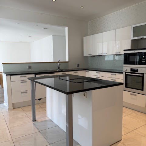 Valkoinen keittiökaapisto ja tasot puujäljitelmällä. Keittiössä on useita ylä- ja alakaappeja, vetolaatikoita sekä kulmakaappi. Kaapistot ovat rungoltaan valkoiset ja oviltaan kerman väriset, ovissa kehysprofiili ja metallivetimet. Työtasot ovat puunsävyiset laminaattitasot. Kokonaisuuteen kuuluu induktio liesi ja tuuletin. Yhdellä seinällä on korkea kaapisto ja toisella pitkä työtaso, joka soveltuu ruoanlaittoon ja työskentelyyn. Keittiökaapisto sopii esimerkiksi omakotitalon tai kerrostaloasunnon keittiöön, jossa tarvitaan runsaasti säilytystilaa ja yhtenäinen kaapisto- ja tasokokonaisuus. Keittiö puretaan viikolla 19.