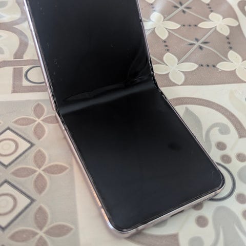 Näyttövikainen Samsung Flip3. Näyttöön ilmestyi kuvien mukainen, pystysuuntainen viiva, normaalin käytön aikana. Muuten puhelin ja kosketus toimii normaalisti.