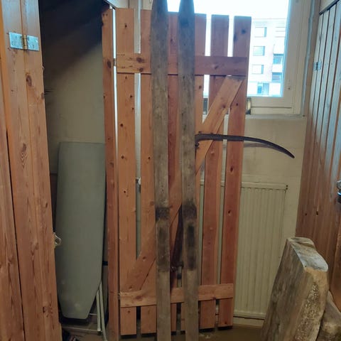 Kuvan käyttämättömät puusukset alkuperäisessä myyntipakkauksessaan, eli sidottuna kahdella narulla yhteen.