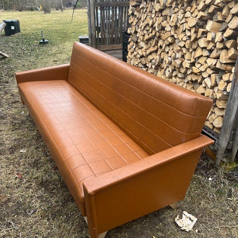 1970-luvun retro puurunkoinen vuodesohva, konjakinruskea