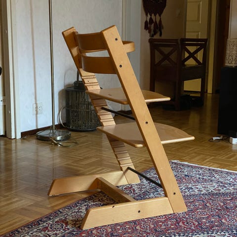 Stokke Tripp Trapp syöttötuoli valkoinen. Säädettävä istuin- ja jalkataso, jotka voidaan asettaa eri korkeuksille lapsen kasvun mukaan. Valmistettu puusta, valkoinen malli.