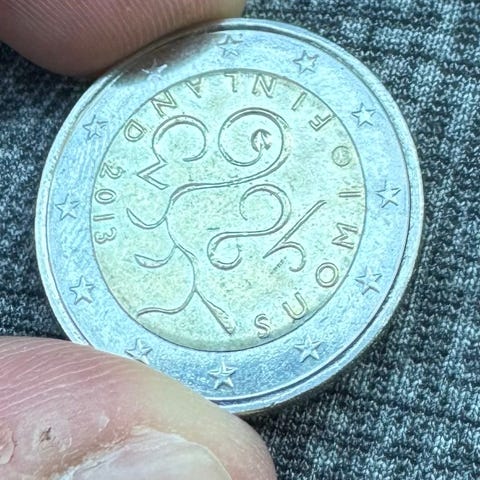 2 euron EU juhlaraha vuodelta 2004, joka on lyöty Suomen EU liittymisen kunniaksi. Ns. risuraha.